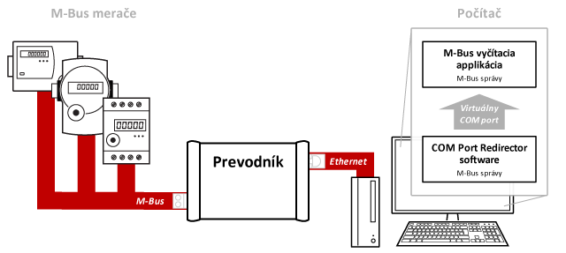 Veľa programov pre M-Bus merače používa štandartný sériovy port pre komunikáciu s M-Bus meračmi a nepodporuje komunikáciu prostredníctvom IP spojenia. Pre naše Ethernetové prevodníky poskytujeme aplikáciu virtuálneho sériového portu. Táto aplikácia umožňuje komunikáciu starším programom cez sériový port.