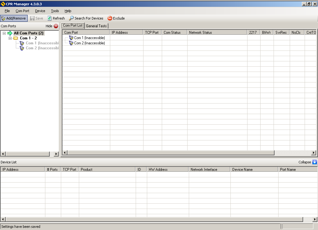 V CPR Manager-y pridať virtuálny COM port. Stlačiť tlačidlo Add/Remove. V dialógu Com ports zvoliť číslo portu a stlačiť tlačidlo OK. Stlačiť tlačidlo Save. | |||