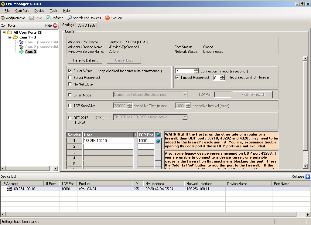 Prekopírovať IP adresu a port prevodníka zo zoznamu Device List do prvého riadku tabuľky pod nadpismi Host a TCP port. Toto nastavenie je možné jednoducho pretiahnuť myškou zo zonamu Device List na daný riadok tabuľky. Stlačiť tlačidlo Save. Touto poslednou operáciou sa vytvorí virtuálny sériový port a je možné ho použiť na komunikáciu s meračmi. |