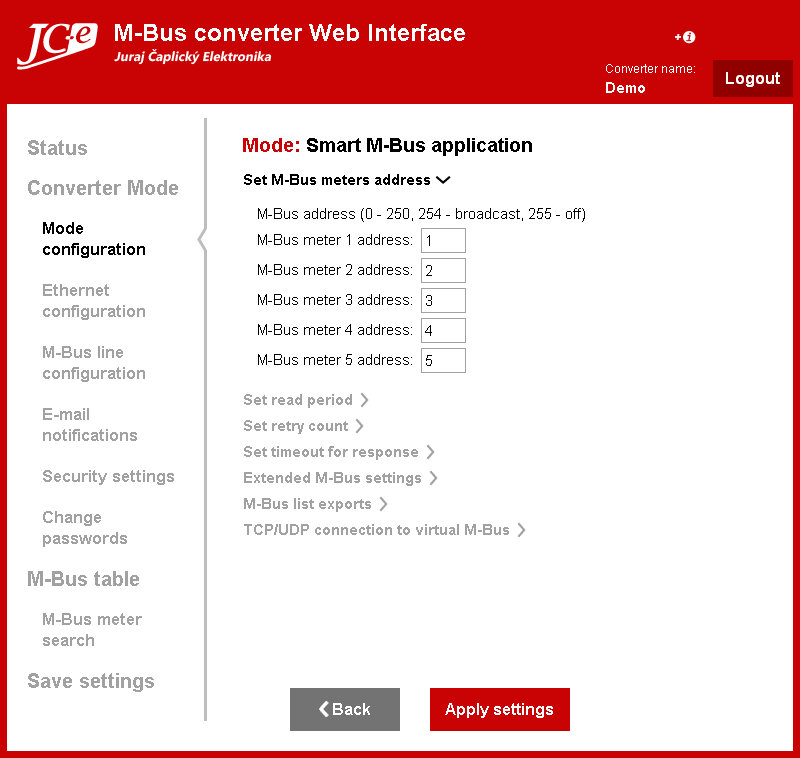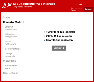 | 2. | Nastaviť prevodník do režimu Smart M-Bus application. Konfigurácia prevodníka po sieti je možná cez Webinterface alebo Telnet na jeho IP adrese. Podrobosti nastavení sa nachádzajú v manuáloch k Webinterface-u a Telnet-ovému rozhraniu dostupné na našich web stránkach v sekcii Download na stránkach daného produktu. |