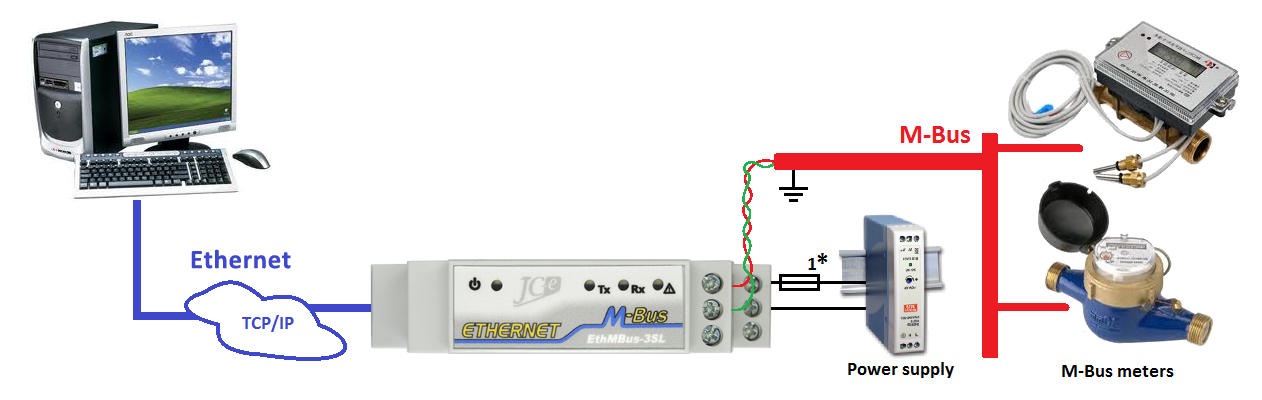 Doporučené zapojenie prevodníka s M-Bus zariadeniami, napájacím zdrojom a pripojením k počítaču prostredníctvom siete Ethernet.