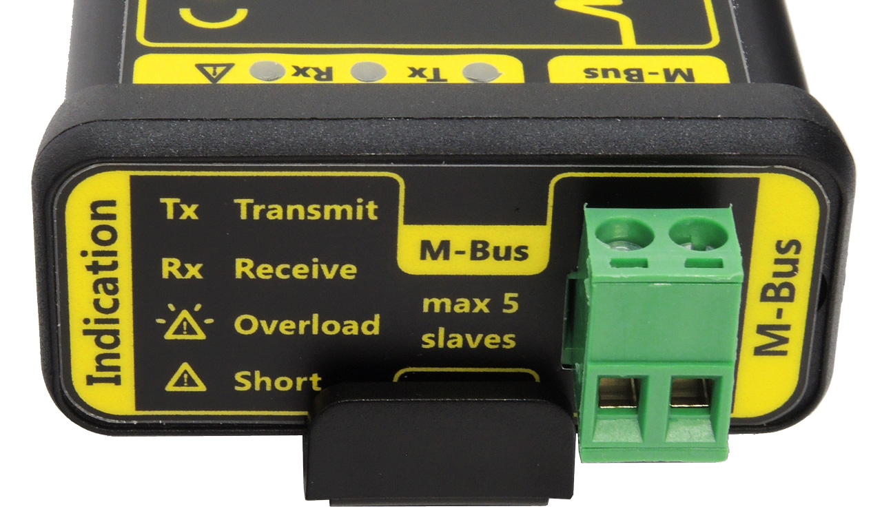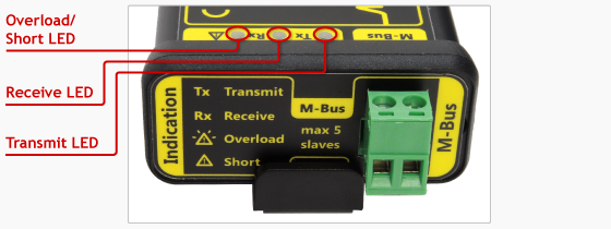 | Overload/Short - červená | indikácia preťaženia M-Bus linky – bliká (kľudový prúd > 8mA), |