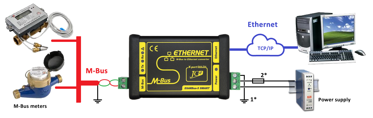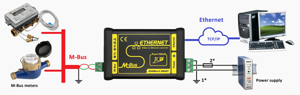 Doporučené zapojenie prevodníka s M-Bus zariadeniami, napájacím zdrojom a pripojením k počítaču prostredníctvom siete Ethernet.