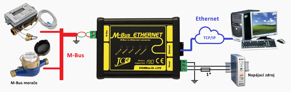 Doporučené zapojenie prevodníka s M-Bus zariadeniami, napájacím zdrojom a pripojením k počítaču prostredníctvom siete Ethernet.