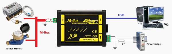 Typical wiring of the converter with M-Bus devices, power supply and a USB connection to the computer.